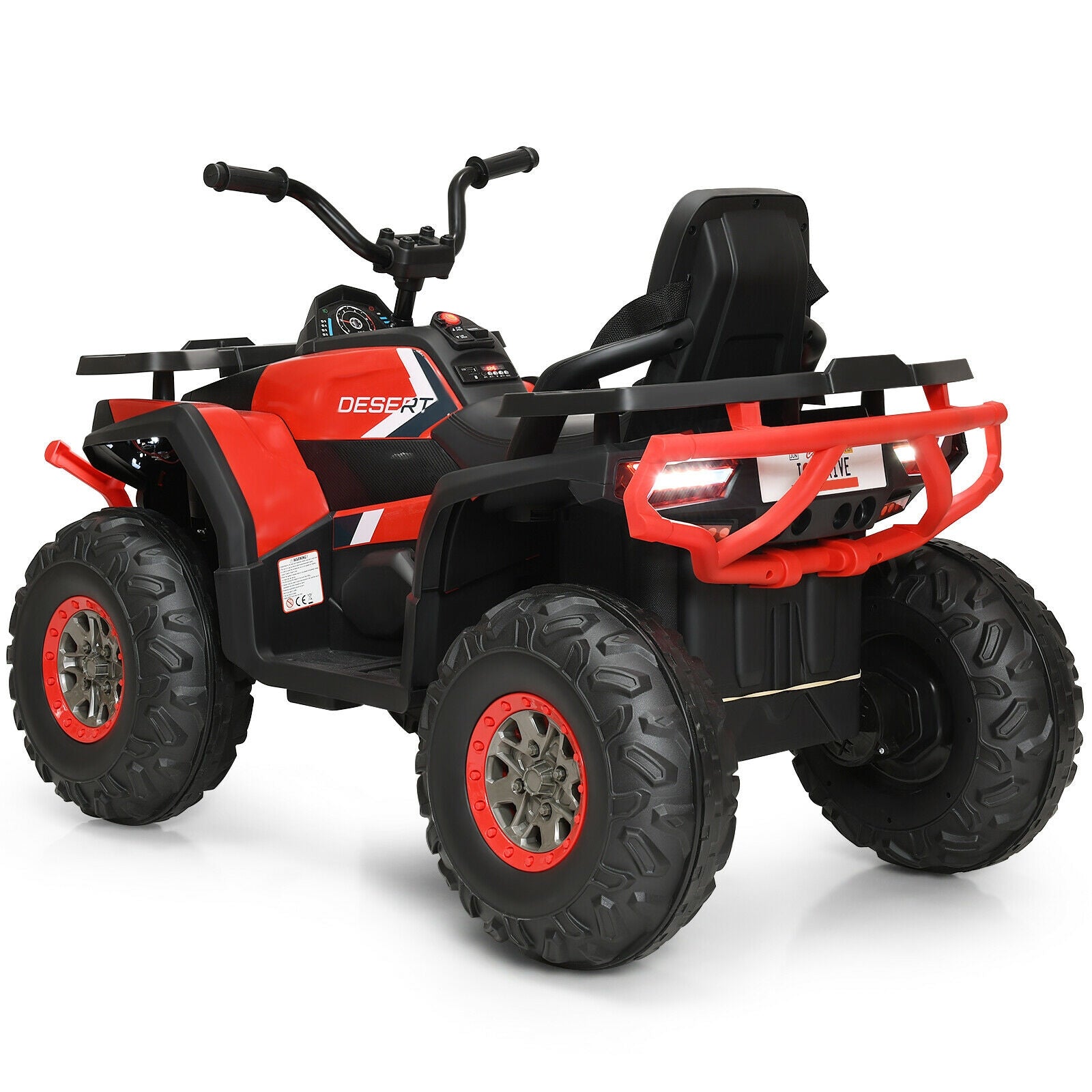 ● PP new material and metal frame to ensure sturdiness and durability● 2 powerful drive motors to reach 3-8 km/h speed● Equipped with AUX input USB port to connect external devices● Variable high/ low speeds for different driving experience● Forward/ reverse switch foot pedal and handlebars for kids to operate easily● Bright LED lights built-in music and stories for added fun● 4 wear-resistant wheels with spring suspension for long-time use● Kids-friendly seat with a safety belt for higher comfort and safety● One-button start design for enough convenience● Comes with a rechargeable battery and UL certified charger adapter● Max weight capacity can reach 110 lbs● Cool ATV design perfect gift to entertain kids over 3 years old● ASTM certification for enhanced reliability