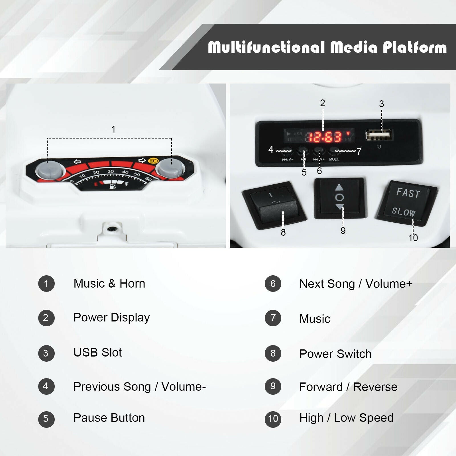 ● Slow start shows perfect performance in driving stability for higher protection to kids● Variable high / low speeds for different driving experience● Move forward or reverse by means of the corresponding switch● Music and stories bring much more fun in driving to dispel boredom● Horn sound and simulative acceleration sound make for a realistic driving experience● Built-in USB slot function for numerous resources● Kids-Friendly seat for higher driving comfortableness● Bright LED headlights lighten up the dark surroundings for added fun as well● 4 wear-resistant wheels combine lasting durability and higher stability● Can ride on beach rubber track cement road wood floor and more● Selected materials for reliable usage ASTM certification for enhanced reliability Installation guide